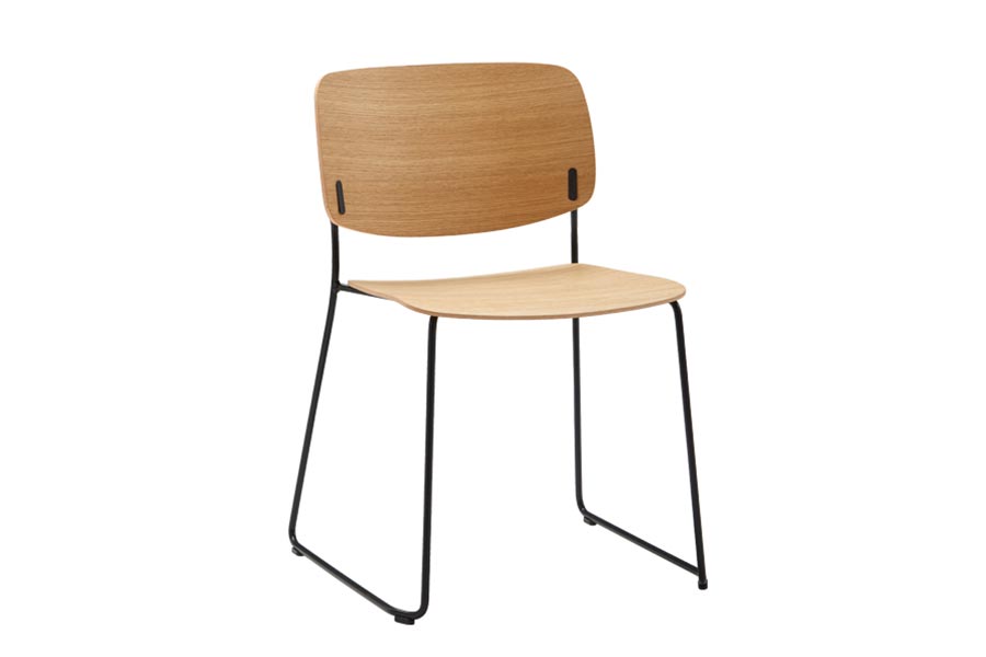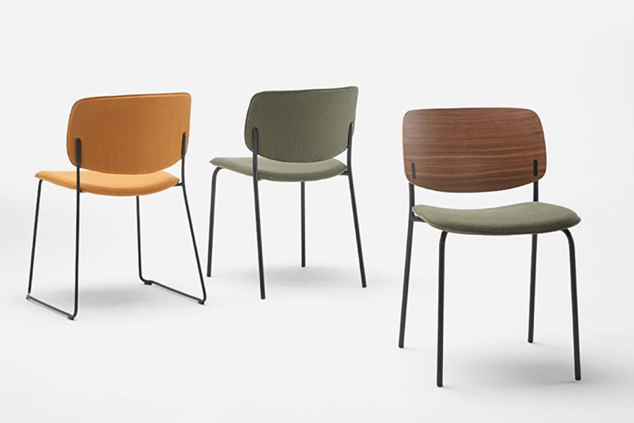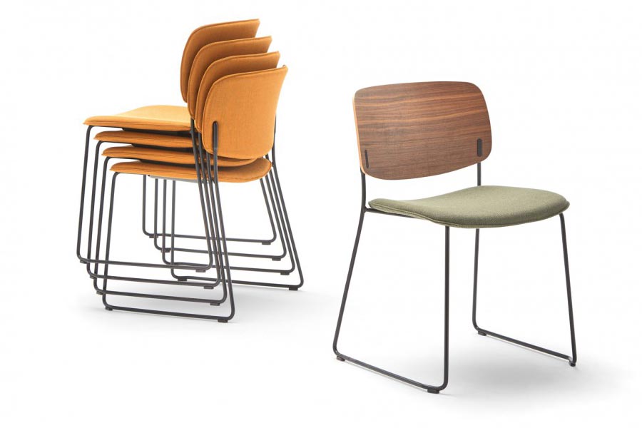 Designed to optimise comfort and versatility of use. ARYN WOOD & TAPIZ chairs are available in four leg or sled base versions, both of them stackable. The wooden seats and backrests are available in oak or walnut veneer in natural colour or stained in any of the stains of the INCLASS swatch book. The upholstered versions are produced in all of the fabrics and leathers from the INCLASS sample book and optionally with fabrics supplied or specified by the customer.