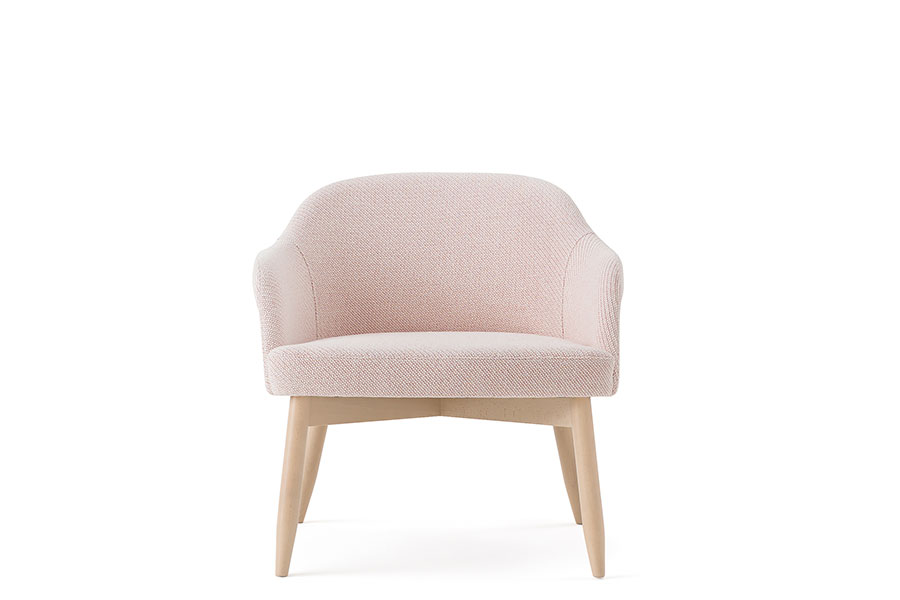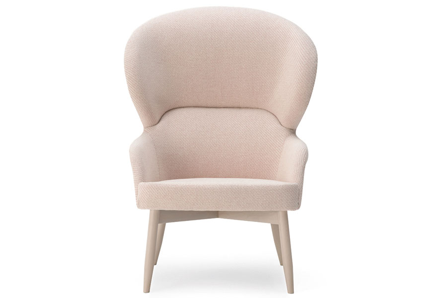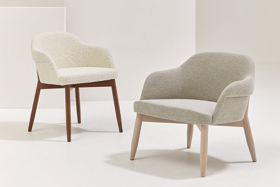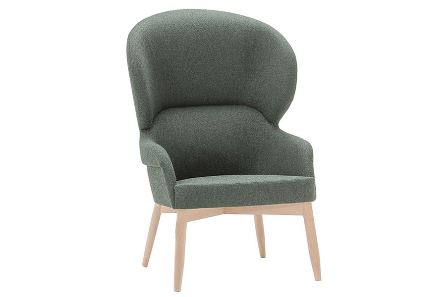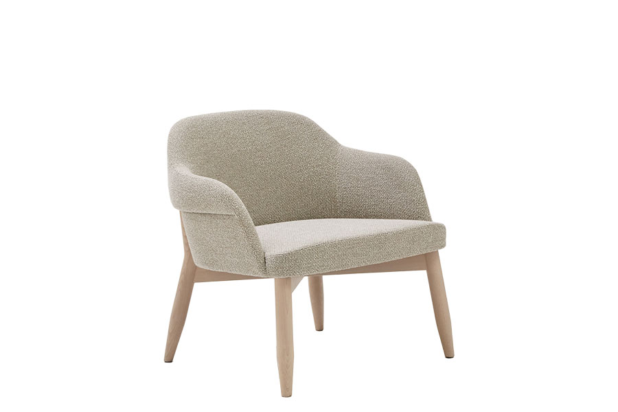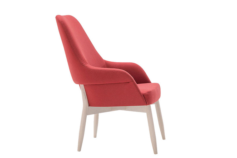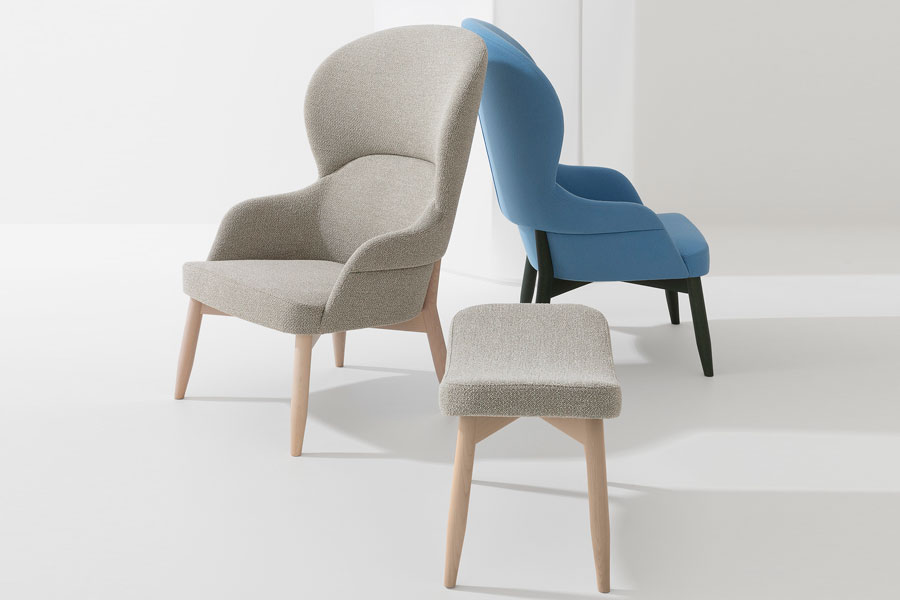 Spy Lounge is characterized by its accurately conceived construction, by the master craftsmanship in the shell which folds and receives the back leg. A softly elegant design which bestows imminent comfort upon its guest and prestige to its surroundings. Stained or lacquered armchair in solid beech, with an upholstered plywood shell. Available in standard factory fabrics or in COM.