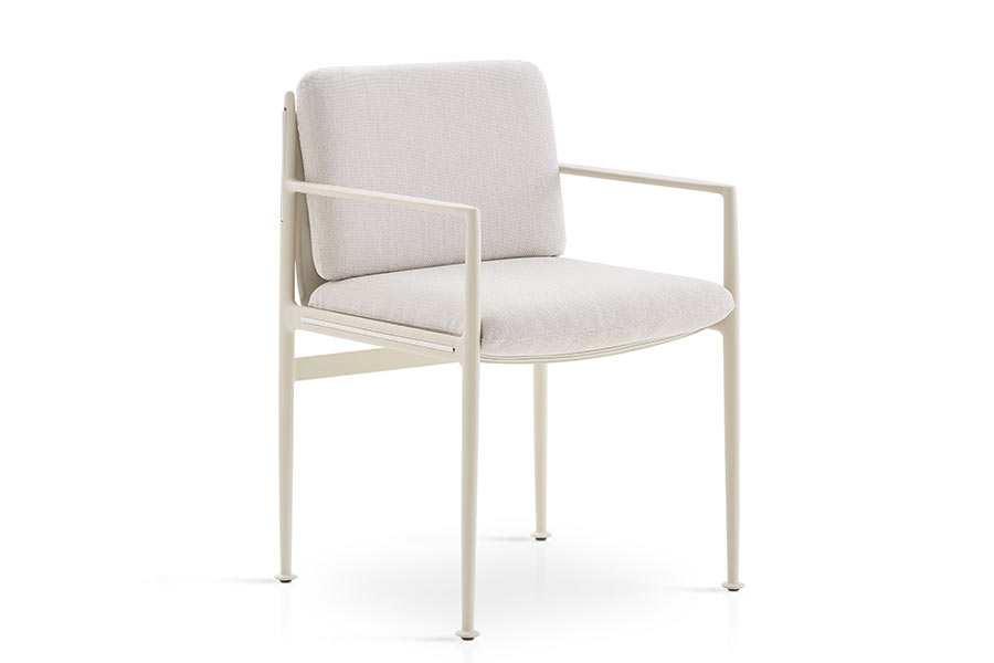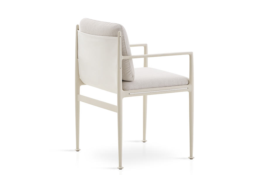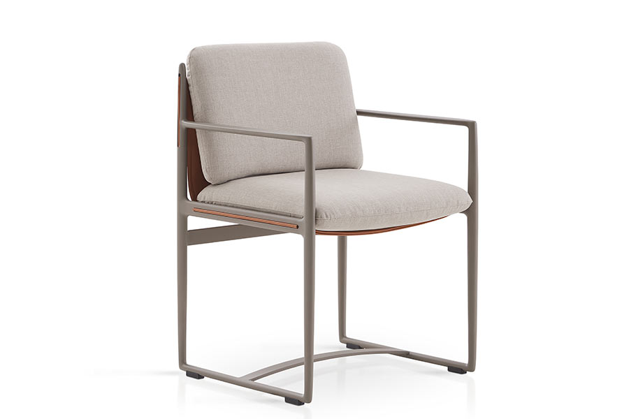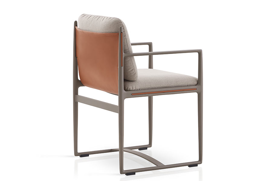 Dining armchairs with structure made of high resistance aluminum profile and legs of injected aluminum, finished with polyester powder. Belt made of Zander technical fabric. Possibility of customization through a wide variety of technical fabrics completely suitable for outdoor use.