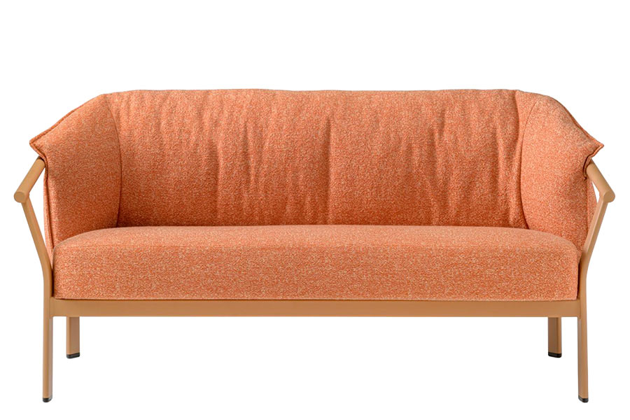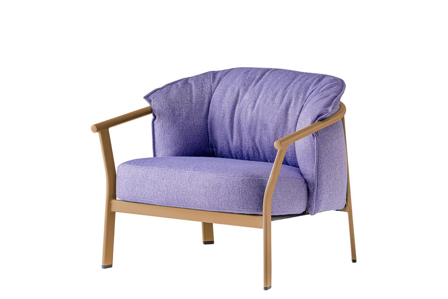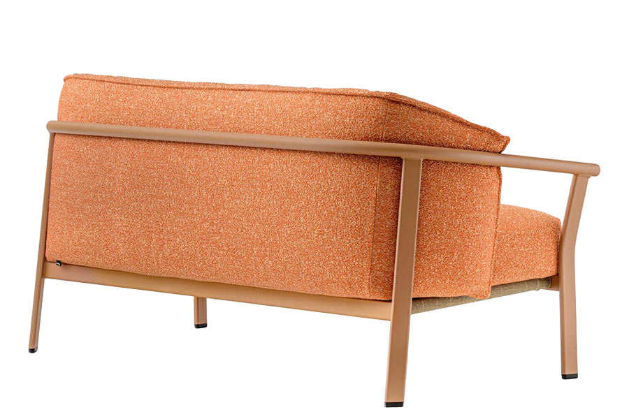 Lamorisse Lounge Outdoor consists of a two-seater sofa and a lounge armchair, whose main feature is the contrast between the sober shape of the frame and the soft, generous and enveloping cushion. The frame in extruded aluminum, with oval legs welded to round tube armrests, holds a large cushion in injected polyurethane foam. The seat is supported by elastic belts to ensure maximum comfort and strength. The covers for both seat and backrest are removable and linked together by a zip for easy maintenance and cleaning. The loose cushions can be removed and stored, and the frame stacked. The water-repellent lining and the use of outdoor fabric ensure excellent performance in all weather conditions.