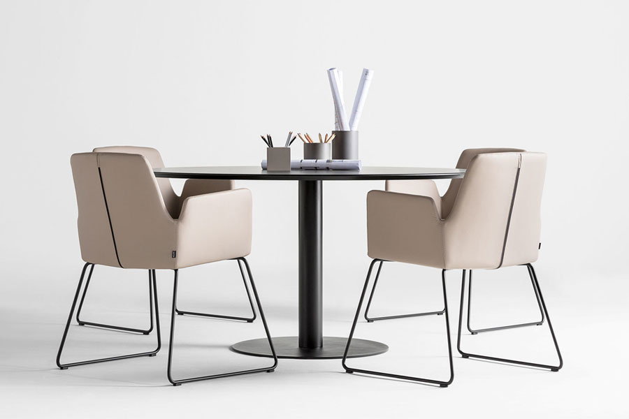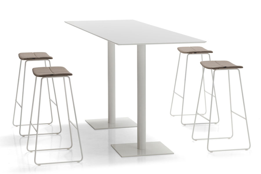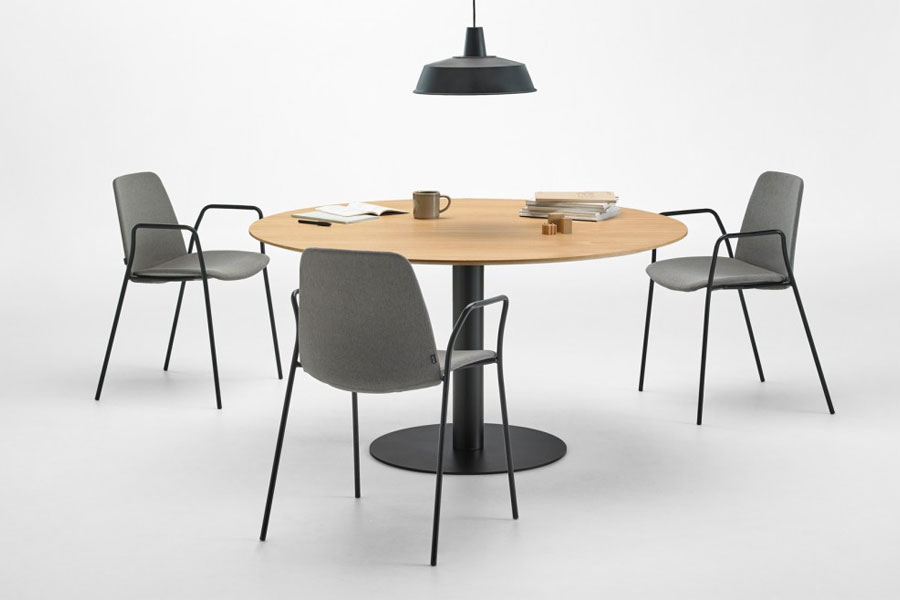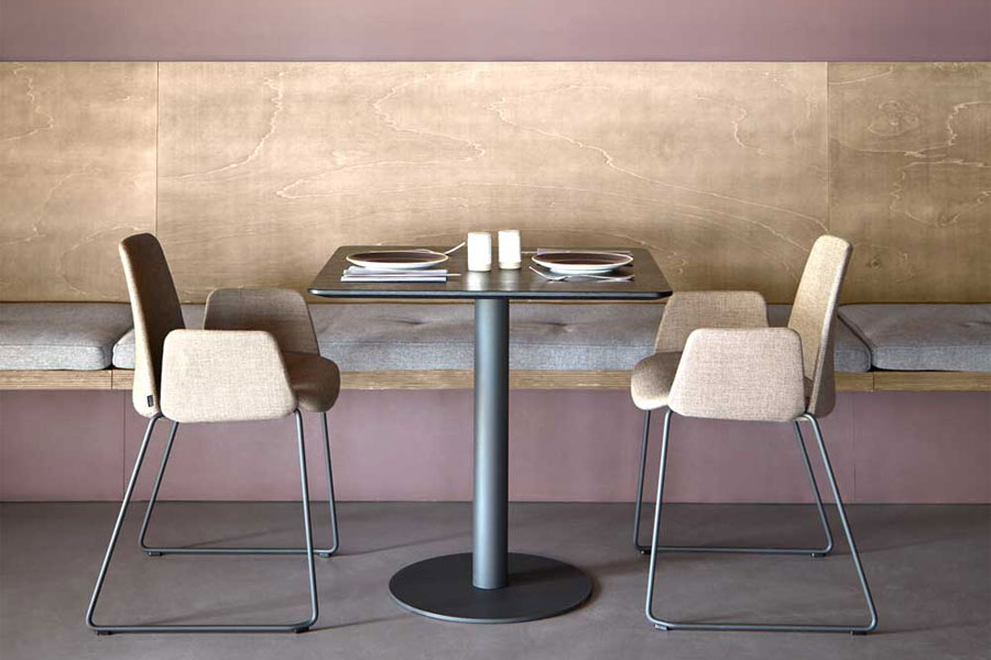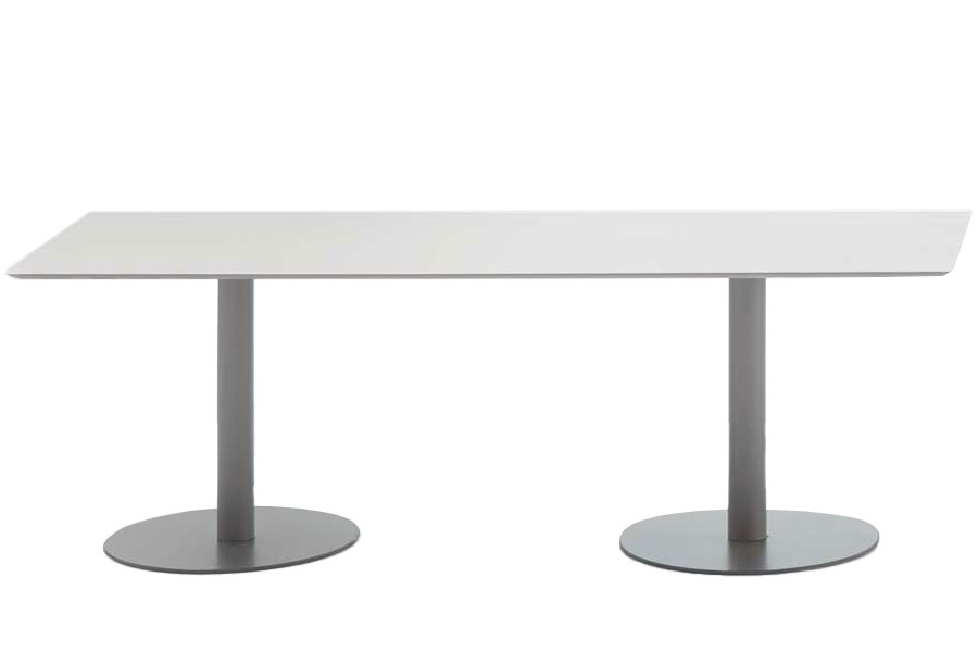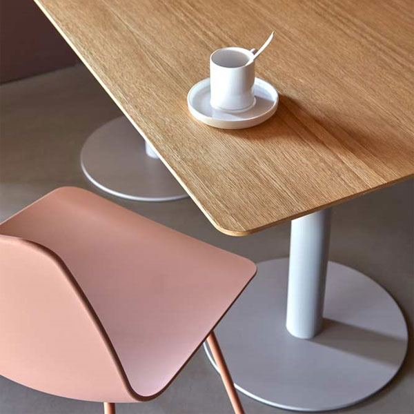 FLAT tables feature a combination of different table tops with central column bases. The bases are manufactured in two heights and are available in two base sizes in either a round or square version. These bases are finished in chrome or polyester paint in all colours of the INCLASS colour samples. The table tops are available in a wide range of formats and can be manufactured in bi-laminated, compact or lacquered MDF or natural oak veneer. For special projects, FLAT tables can be manufactured in other materials, sizes or colours.
