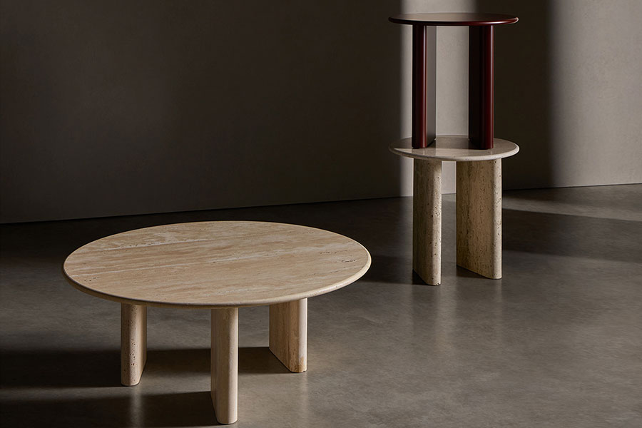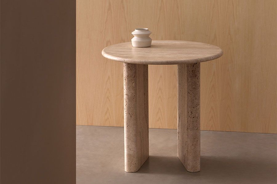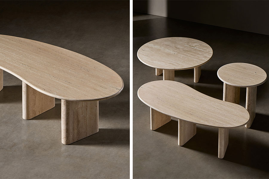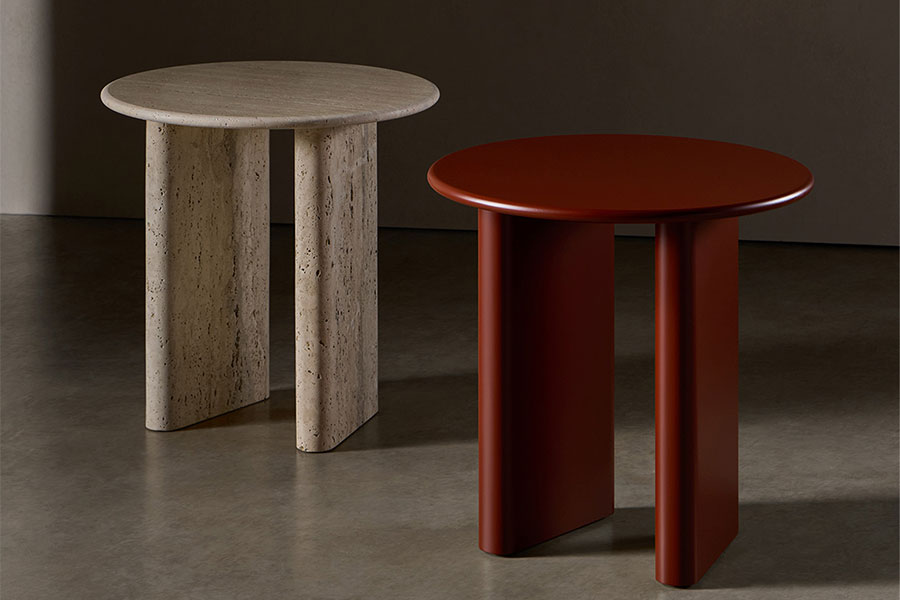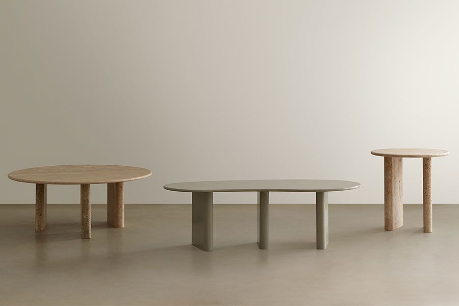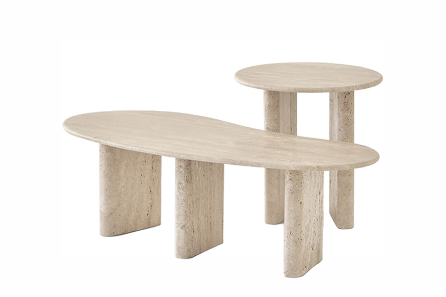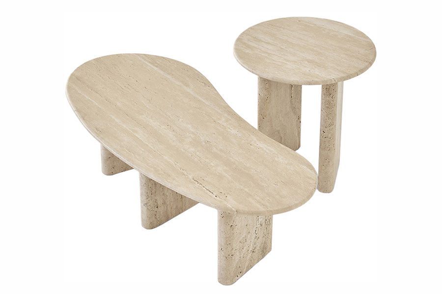 Treviso is an iconic collection consisting of three sculptural tables that revisit classical architecture from the aesthetics of the present. Side tables and coffee tables collection, composed of a circular or organic-shaped top with a rounded edge, and two or three round-shaped legs. Taking the use of travertine marble as a starting point, they are inspired by the details and proportions of classical Italian architecture, seeking to highlight the inherent purity of the material. In addition to travertine marble, the Treviso tables are available in matte or glossy lacquered MDF.