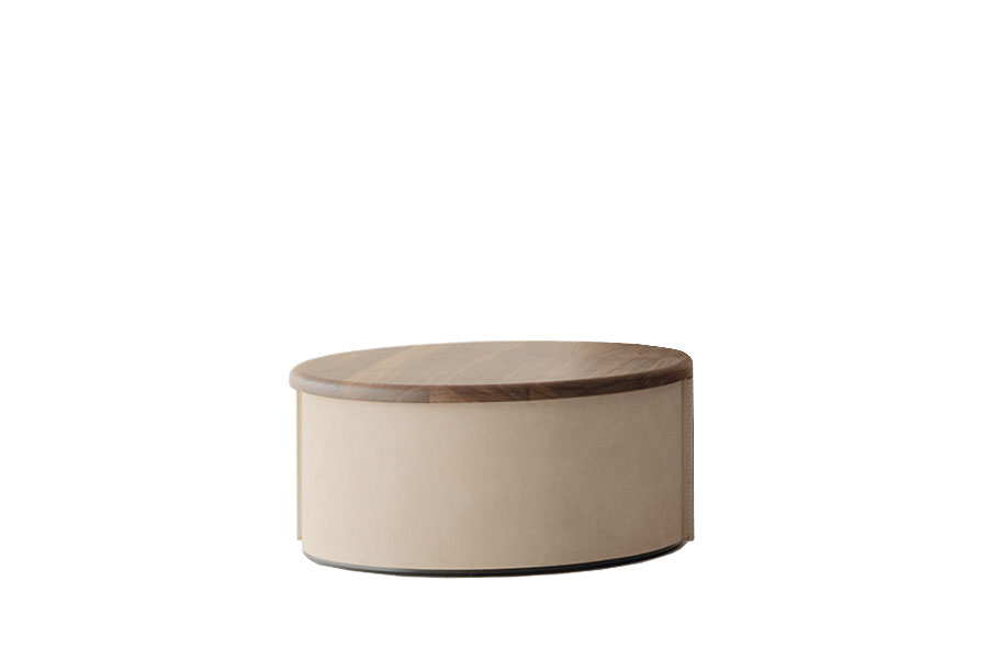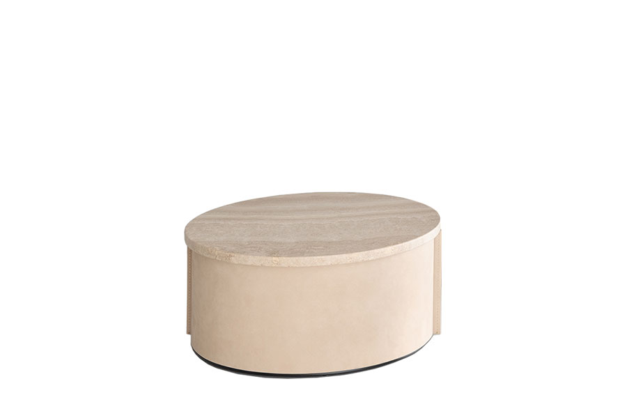 A circle of marble or wood, sustained by an essential strip of leather, its place is anywhere we desire, its time is now and forever. Tappo coffee tables with top in Travertine stone or solid Canaletto walnut wood. Wooden base painted black. Structure in high-wearing plastic covered in leather with special raw cut edges finishing, available in three different leathers: Soffio, Setanil and Natural Velour. If no preference is specified, the edges feature tone-on-tone lacquering.